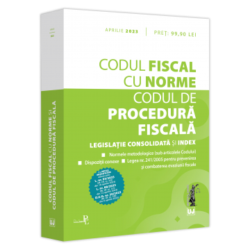 Editia a 7-a (revizuita) a lucrarii, Codul fiscal cu Norme si Codul de procedura fiscala: aprilie 2023 (tiparita pe hartie alba de calitate superioara), ofera utilizatorilor textul consolidat al Codurilor, normele metodologice de aplicare a Codului fiscal (cu noua modificare adusa prin H.G. nr. 181/2023 – M. Of. nr. 187 din 6 martie 2023), introduse sub articolele sau, dupa caz, sub alineatele aferente, precum si L. nr. 241/2005 pentru prevenirea si combaterea evaziunii fiscale.