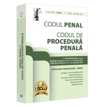 Volumul Codul penal si Codul de procedura penala: ianuarie 2024 cuprinde si: decizii ale Curtii Constitutionale; recursuri in interesul legii si hotarari prealabile; corelatii cu reglementarile anterioare; Legea nr. 6/2021 privind stabilirea unor masuri pentru punerea in aplicare a Regulamentului (UE) 2017/1.939 al Consiliului din 12 octombrie 2017 de punere in aplicare a unei forme de cooperare consolidata in ceea ce priveste instituirea Parchetului European (EPPO) (extras)Legea nr. 146/2021 privind monitorizarea electronica in cadrul unor proceduri judiciare si executional penale (extras)O.G. nr. 9/2021 privind stabilirea unor masuri de facilitare a utilizarii informatiilor financiare si a analizelor financiare in scopul prevenirii, depistarii, investigarii sau urmaririi penale a anumitor infractiuni; Legea nr. 172/2022 pentru ratificarea Protocolului nr. 16 la Conventia pentru apararea drepturilor omului si a libertatilor fundamentale, adoptat la Strasbourg la 2 octombrie 2013 si semnat de Romania la Strasbourg la 14 octombrie 2014; Legea nr. 173/2022 pentru adoptarea unor masuri necesare punerii in aplicare a Protocolului nr. 16 la Conventia pentru apararea drepturilor omului si a libertatilor fundamentale, adoptat la Strasbourg la 2 octombrie 2013 si semnat de Romania la Strasbourg la 14 octombrie 2014 (extras).