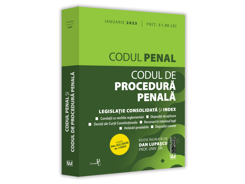 Editia a 26-a (revizuita) a lucrarii, Codul penal si Codul de procedura penala: ianuarie 2023, tiparita pe hartie alba de calitate superioara si ingrijita de prof. univ. dr. Dan Lupascu, cuprinde Codul penal si Codul de procedura penala actualizate, articolele celor doua Coduri fiind insotite, acolo unde este cazul, de dispozitii tranzitorii, de aplicare sau conexe, necesare unei depline intelegeri a reglementarii.