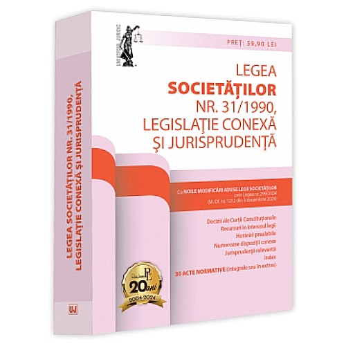 Editia a 10-a (revizuita) a culegerii Legea societatilor nr. 31/1990, legislatie conexa si jurisprudenta, tiparita pe hartie alba de calitate superioara, contine: Legea societatilor nr. 31/1990 (cu un index concis, dar relevant, si cu noile modificari aduse prin Legea nr. 299/2024 – M. Of. nr. 1212 din 3 decembrie 2024); alte 29 acte normative (integrale sau in extras), importante pentru domeniul comercial, inclusiv Legea registrului comertului nr. 265/2022, O.U.G. nr. 44/2008 privind persoanele fizice autorizate si O.U.G. nr. 120/2021 privind administrarea, functionarea si implementarea sistemului national privind factura electronica RO e-Factura si factura electronica in Romania (modificata prin O.U.G. nr. 138/2024 – M. Of. nr. 1222 din 5 decembrie 2024); decizii ale Curtii Constitutionale; recursuri in interesul legii; hotarari prealabile; numeroase dispozitii conexe (trimiteri sau scurte extrase din acte normative incidente, dupa caz); jurisprudenta (atent selectata); alte interventii redactionale utile.